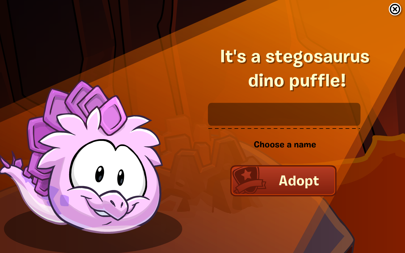 Tam zadáte jméno puffla a kliknete na Adopt. Tím adoptujete Diosauřího Puffla.